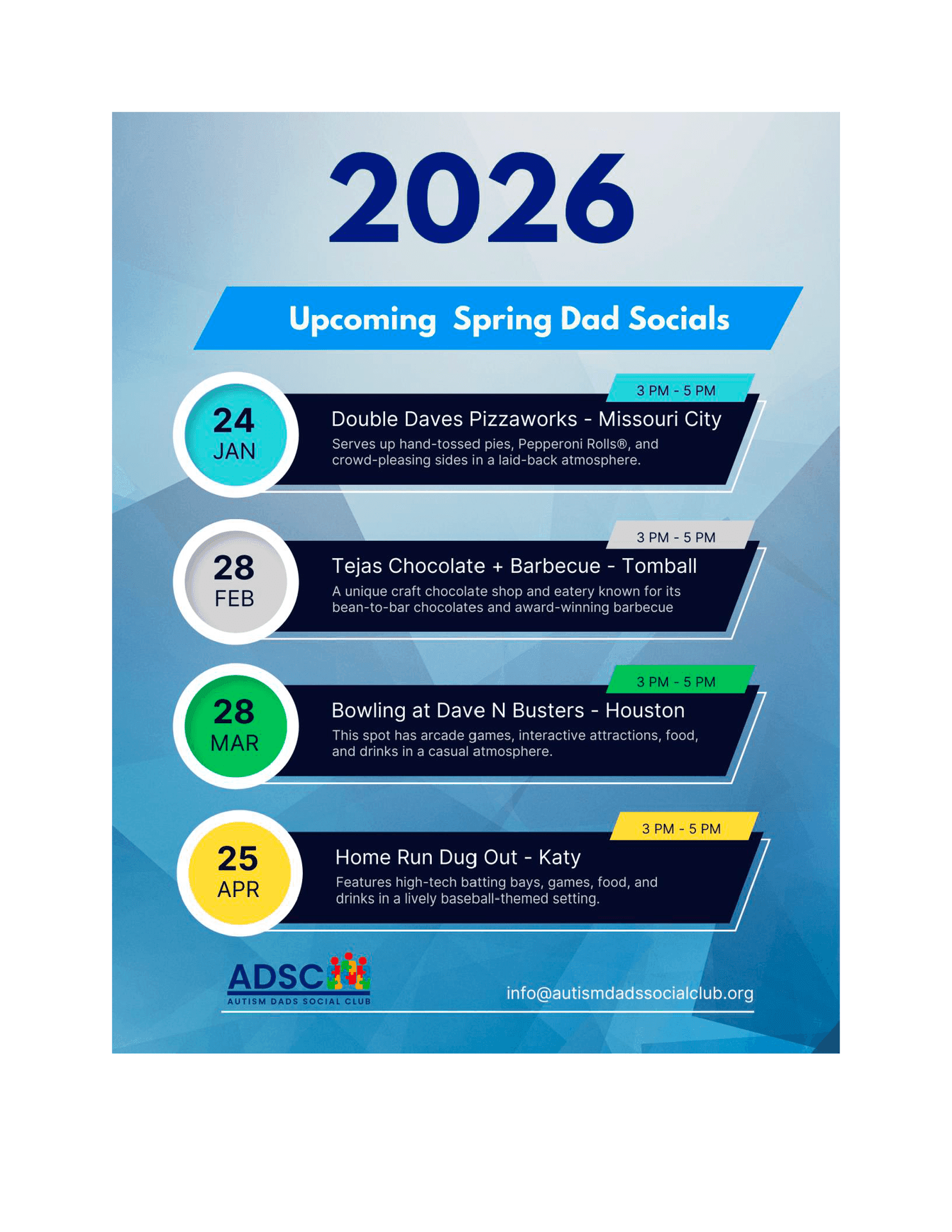 Specific details (dates, times, and locations) will be shared via Eventbrite, our social media platforms, and our email distribution list.